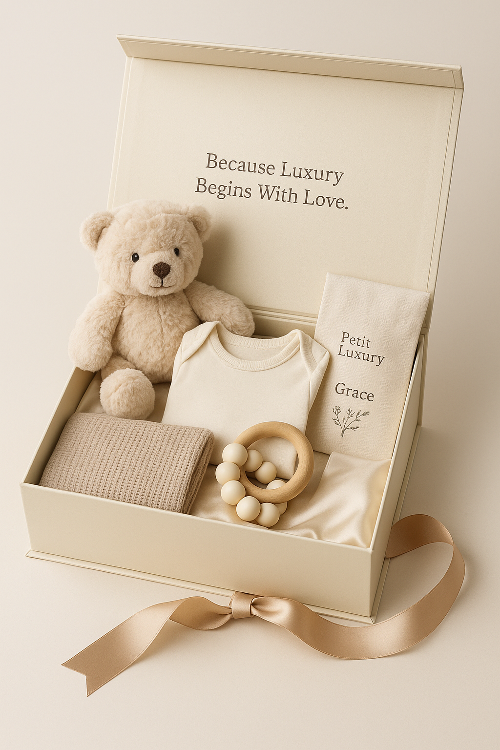A beautifully curated ivory gift box, wrapped in champagne-gold satin and filled with treasures for life’s most delicate moments.