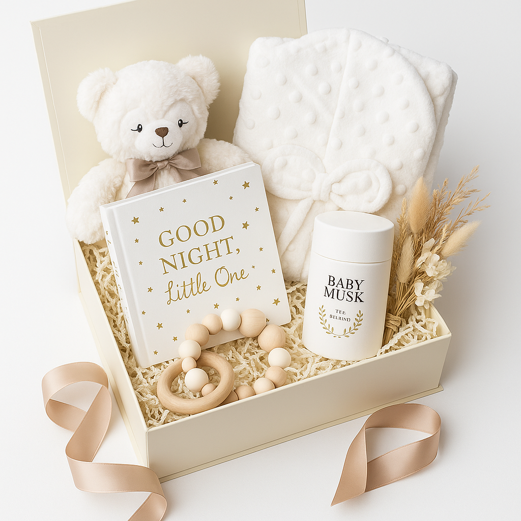 Inside: a plush toy, organic baby body, cozy blanket, natural wooden teether, and a clean cotton-scented sachet — everything arranged in peaceful perfection.