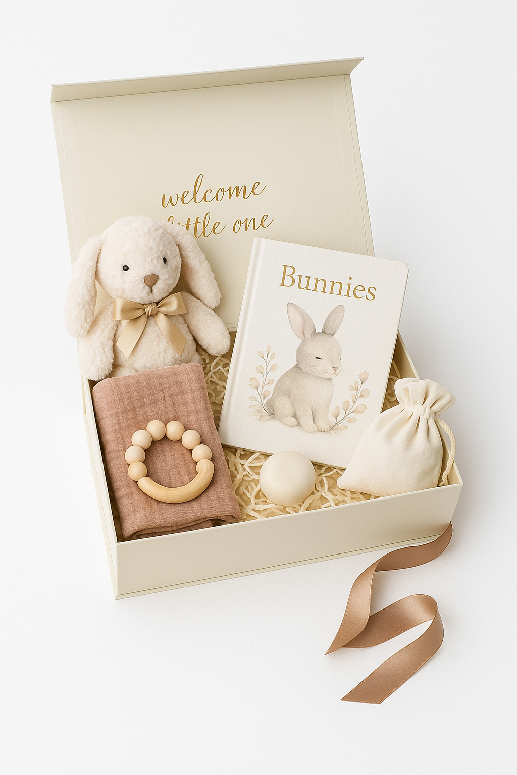 Inside: a plush toy, soft baby body, cozy blanket, teether, and an aromatic sachet — all chosen for the gentlest beginnings.