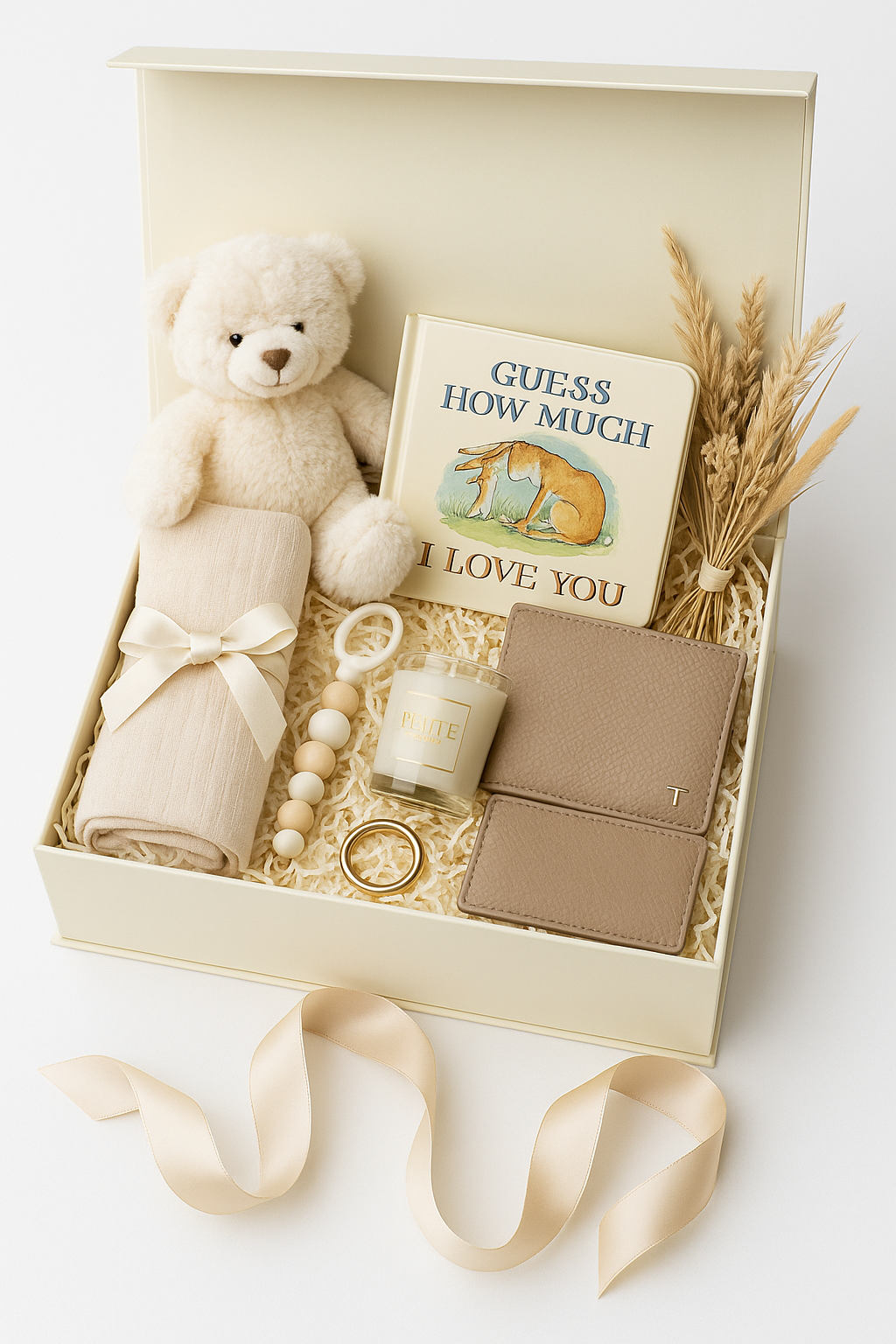 Inside: a handpicked selection of essentials — plush toy, organic cotton body, cozy blanket, wooden teether, and an aroma sachet, arranged with delicate precision.